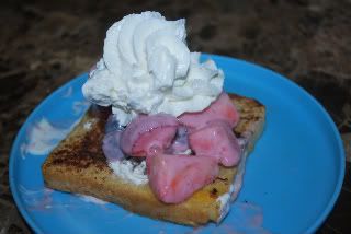 Assemble on a plate with warm french toast, yogurt sauce, and whipped cream on top. Everyone, including Pookey and Mr. T LOVED it!