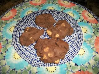 Preheat oven to 350ºF or if you're here in Germany with me, 190ºC. Take a bowl and beat the butter, and the two sugars together until blended. Beat in one egg at a time, this should make it nice and creamy. Add the vanilla, and mix in. In another bowl, mix together the flour, cocoa powder, baking soda and salt. Once mixed, add it to the sugar mix, until it's all well blended. The mixture is going to be very stiff. Now it's time to mix in the chips. You'll want to hand mix these in, because you don't want the chips to break. After chips are mixed in, you can spoon scoop the batter onto cookie sheets. I always use my pampered chef pizza stones, as they're super easy clean up, and they don't stick to the service ever! (of course, now that I say this we'll shall see what happens next time I make cookies...lol) Bake in the preheated oven for about 8-9 minutes. The cookies won't spread, so sometimes it's hard to tell if they're done. Usually you can see the peaks of them become a bit browned (mind you, you'll have to look closely, as they're already brown thanks to the Cocoa Powder). I just made sure the top was hardened a bit, and viola, they came out hot and delish!